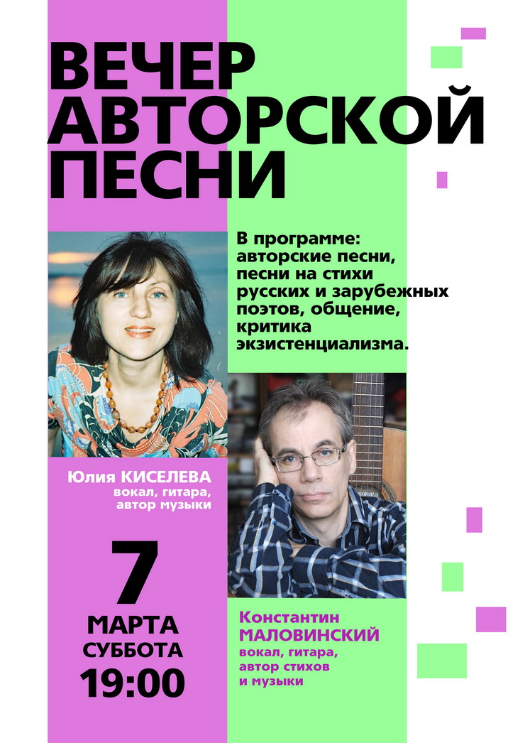 7 марта вечер авторской песни с Юлией Киселевой и Константином Маловинским.